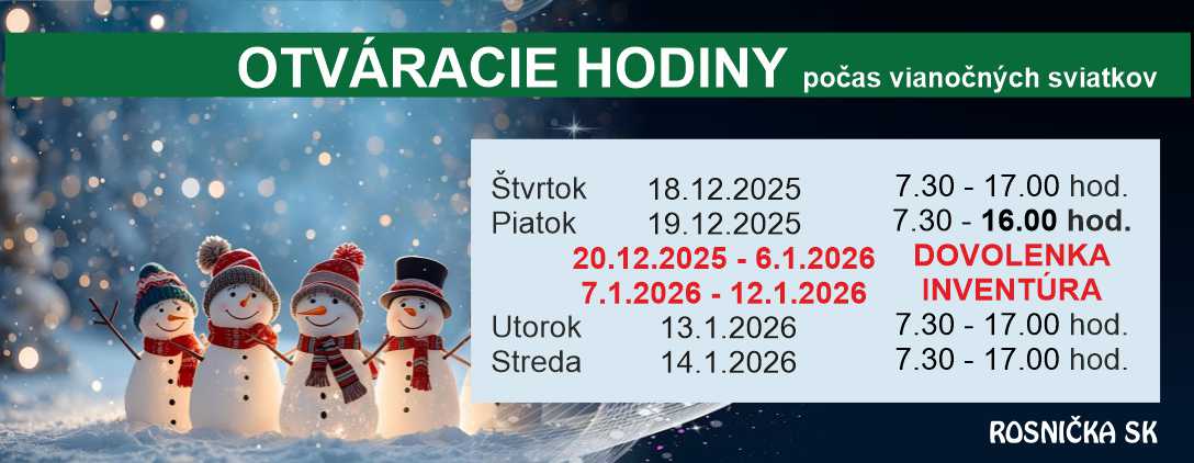 Najbližšie objednávky po Novom roku prijímame výlučne mailom (nie osobne) od 7.1.2026 s možnosťou vyskladnenia od 13.1.2026. Štandardný režim našej spoločnosti nabieha od dátumu 13.1.2026 od 7.30 hod. (fyzické preberanie objednávok).