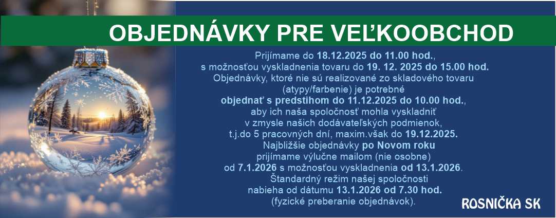 OBJEDNÁVKY prijímame do 18.12.2025 do 11.00 hod., s možnosťou vyskladnenia tovaru do 19. 12. 2025 do 15.00 hod. Objednávky, ktoré nie sú realizované zo skladového tovaru (atypy/farbenie) je potrebné objednať s predstihom do 11.12.2025 do 10.00 hod., aby ich naša spoločnosť mohla vyskladniť v zmysle našich dodávateľských podmienok, t.j.do 5 pracovných dní, maxim.však do 19.12.2025.