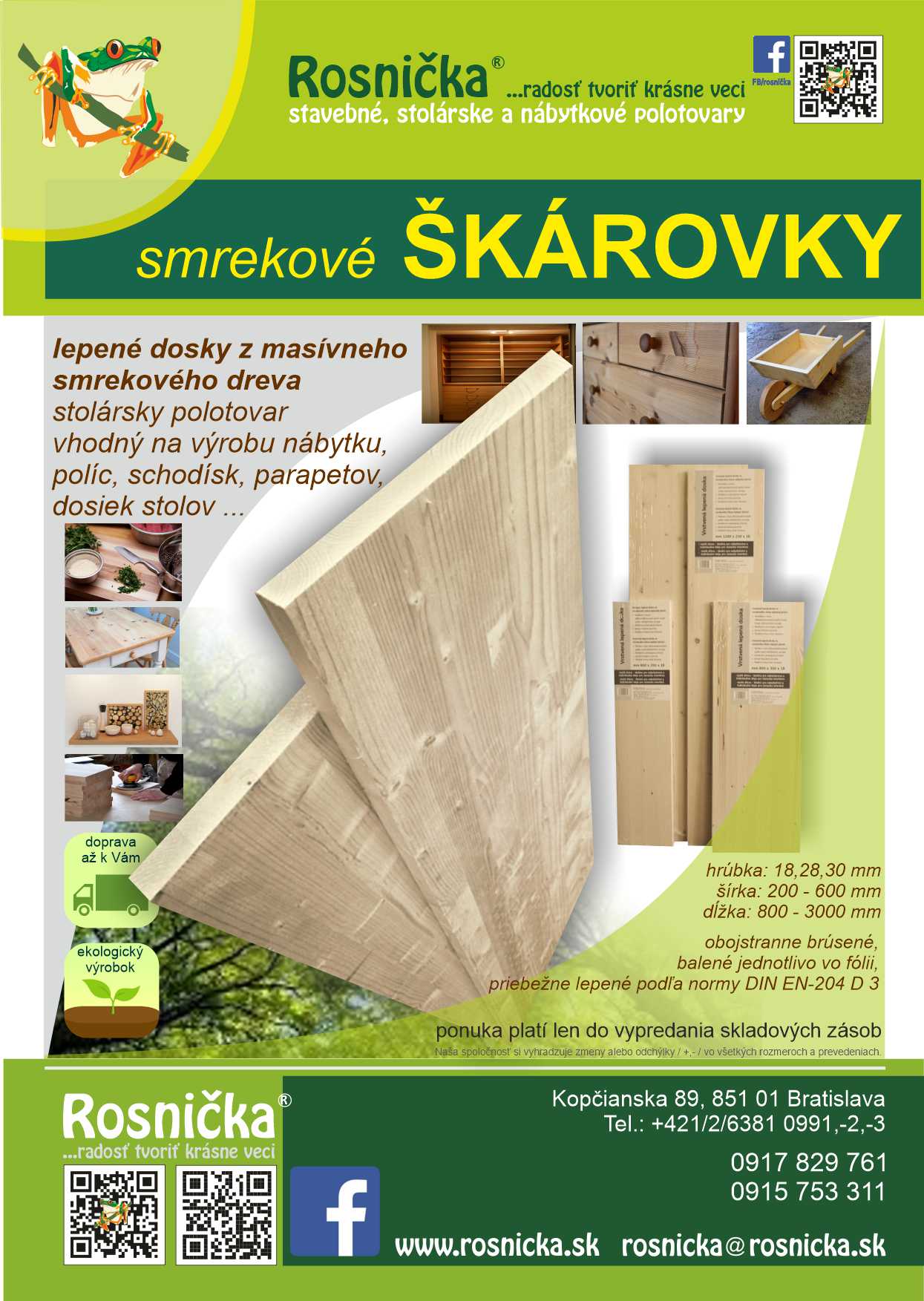 ŠKÁROVKY – Úžasný polotovar z masívneho dreva pre kutilské aj profi projekty. Polička, doska stola, jednoduchá skrinka alebo dokonalé schodisko – aj pri tomto všetkom Vám vie byť škárovka skvelým pomocníkom. Je zhotovená lepením z smrekového, dubového alebo bukového dreva. Povrchovo brúsená so skosenými hranami a balená jednotlivo vo fólii. Kliknite sa na náš e-shop , vyberte si rozmer, ktorý potrebujete a môžete si ich hneď objednať aj s dopravou. Nezabudnite na drobnosti – vruty, pilky, brúsne papiere, stolárske zvierky…. máme toho v ponuke omnoho viac.