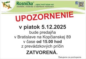UPOZORNENIE Posted on25. novembra 2025Authormarket_janka.f V piatok 5.12.2025 od 15:00 hod. bude naša predajňa v Bratislave na Kopčianskej 89 z PREVÁDZKOVÝCH PRÍČIN ZATVORENÁ. Ďakujeme za pochopenie